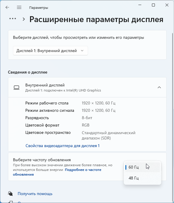 В настройках экрана доступны две частоты обновления — 60 и 48 Гц. Вторая может пригодится при просмотре кинофильмов. По крайней мере, при родном разрешении экрана вывод идет с глубиной цвета 8 бит на цвет.