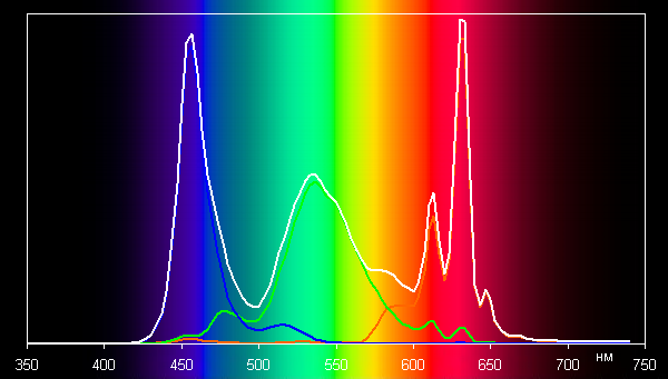 Поэтому визуально цвета на этом экране имеют естественную насыщенность. Ниже приведен спектр для белого поля (белая линия), наложенный на спектры красного, зеленого и синего полей (линии соответствующих цветов):