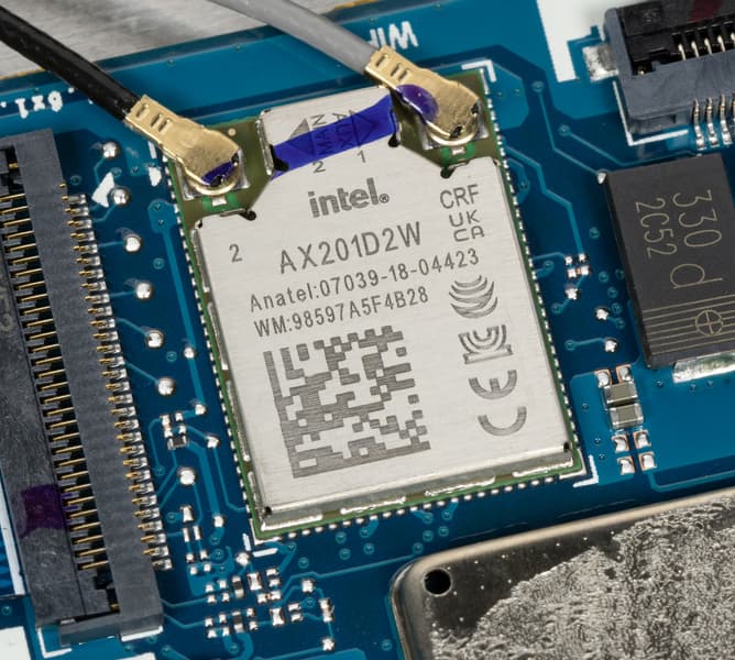 Проводного сетевого адаптера в Honor MagicBook X 14 2023 нет, а функции беспроводного выполняет распаянный модуль Intel Wi-Fi 6 AX201D2W.