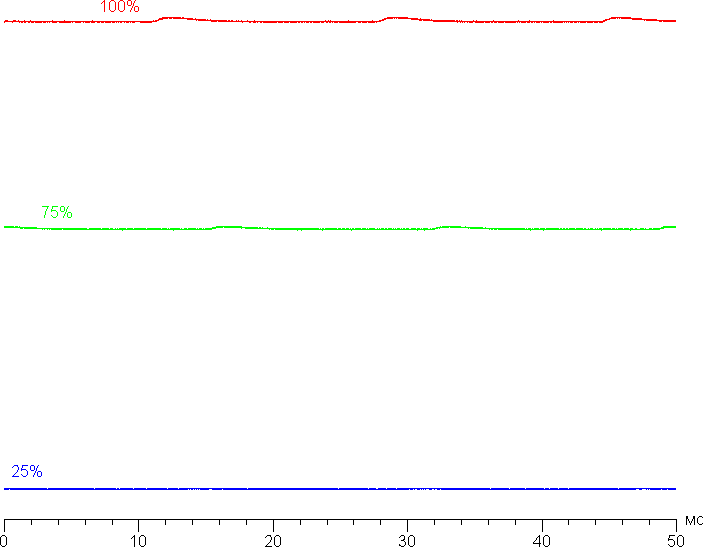 На любом уровне яркости значимая модуляция подсветки отсутствует, поэтому нет и никакого мерцания экрана. В доказательство приведем графики зависимости яркости (вертикальная ось) от времени (горизонтальная ось) при различных значениях настройки яркости:
