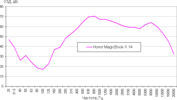 Если ноутбук не нагружать совсем, то его система охлаждения может работать в пассивном режиме. При большой нагрузке шум от системы охлаждения не очень высокий. Характер шума ровный и раздражения не вызывает. Спектрограмма, полученная под максимальной нагрузкой в режиме Производительный, очень ровная, и в диапазоне частот, где звуки особенно могут вызывать раздражение, выраженных пиков нет: