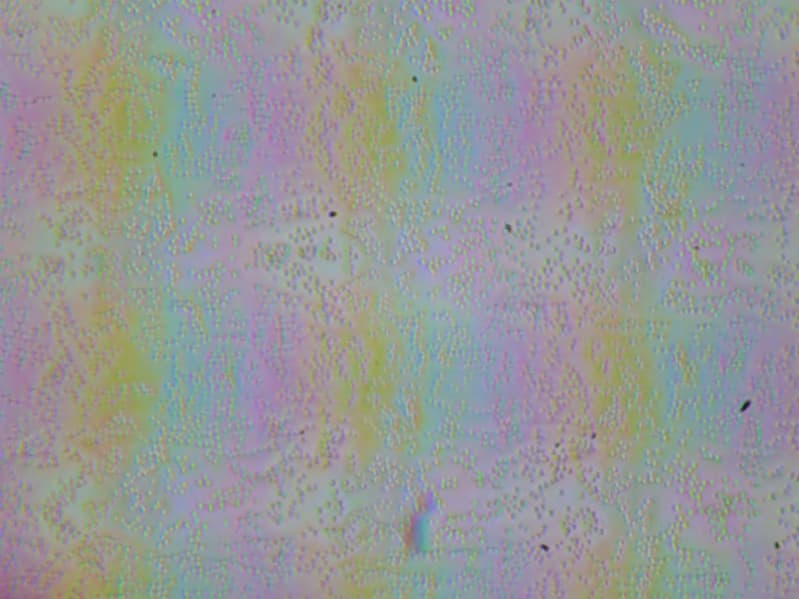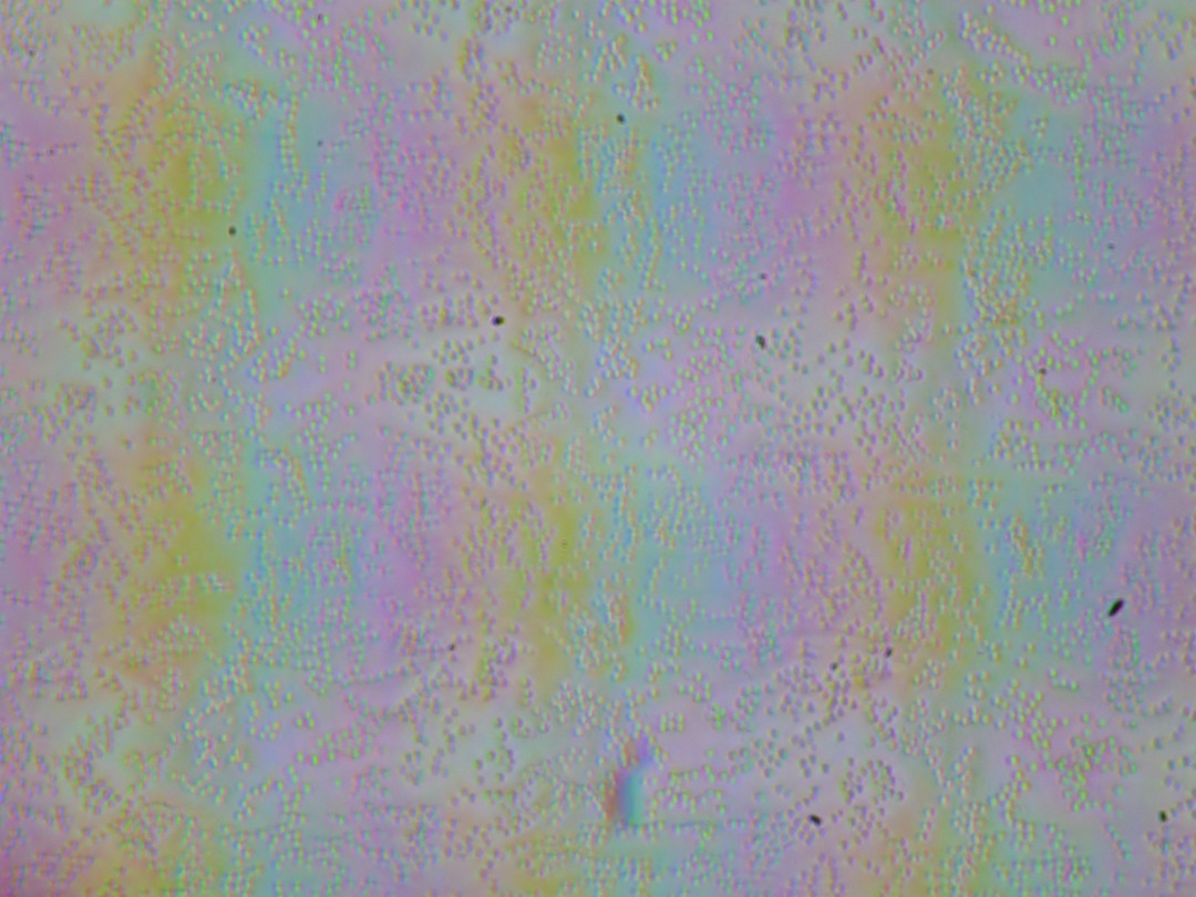 Зерно этих дефектов в несколько раз меньше размеров субпикселей (масштаб этих двух фотографий примерно одинаковый), поэтому фокусировка на микродефектах и «перескок» фокуса по субпикселям при изменении угла зрения выражены слабо, из-за этого нет и «кристаллического» эффекта.