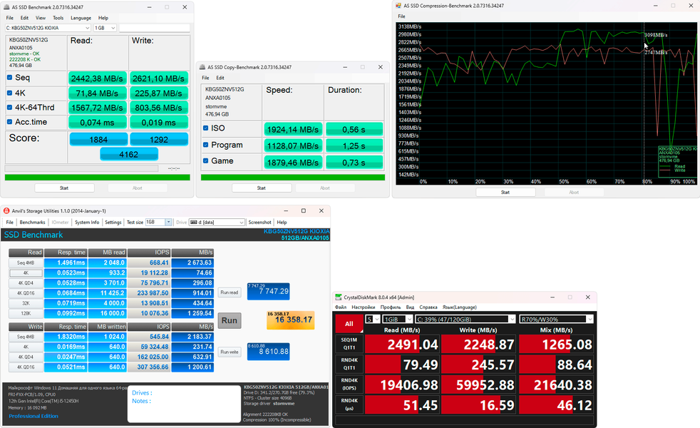 По результатам тестирования, производительность SSD оказалась ниже заявленной в спецификациях, однако для ноутбука такого класса ее можно назвать исчерпывающей. Мы протестировали скоростные характеристики SSD в трех бенчмарках при работе ноутбука от электросети и от аккумулятора, получив следующие показатели.
