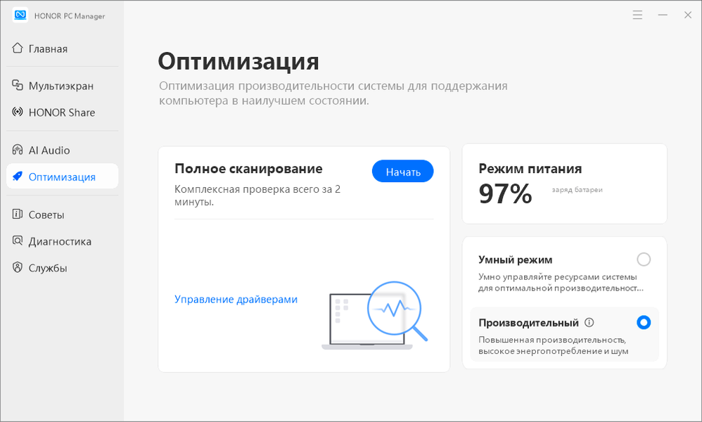 Утилита Honor PC Manager предоставляет пользователю выбор из двух режимов работы ноутбука: производительный или умный.