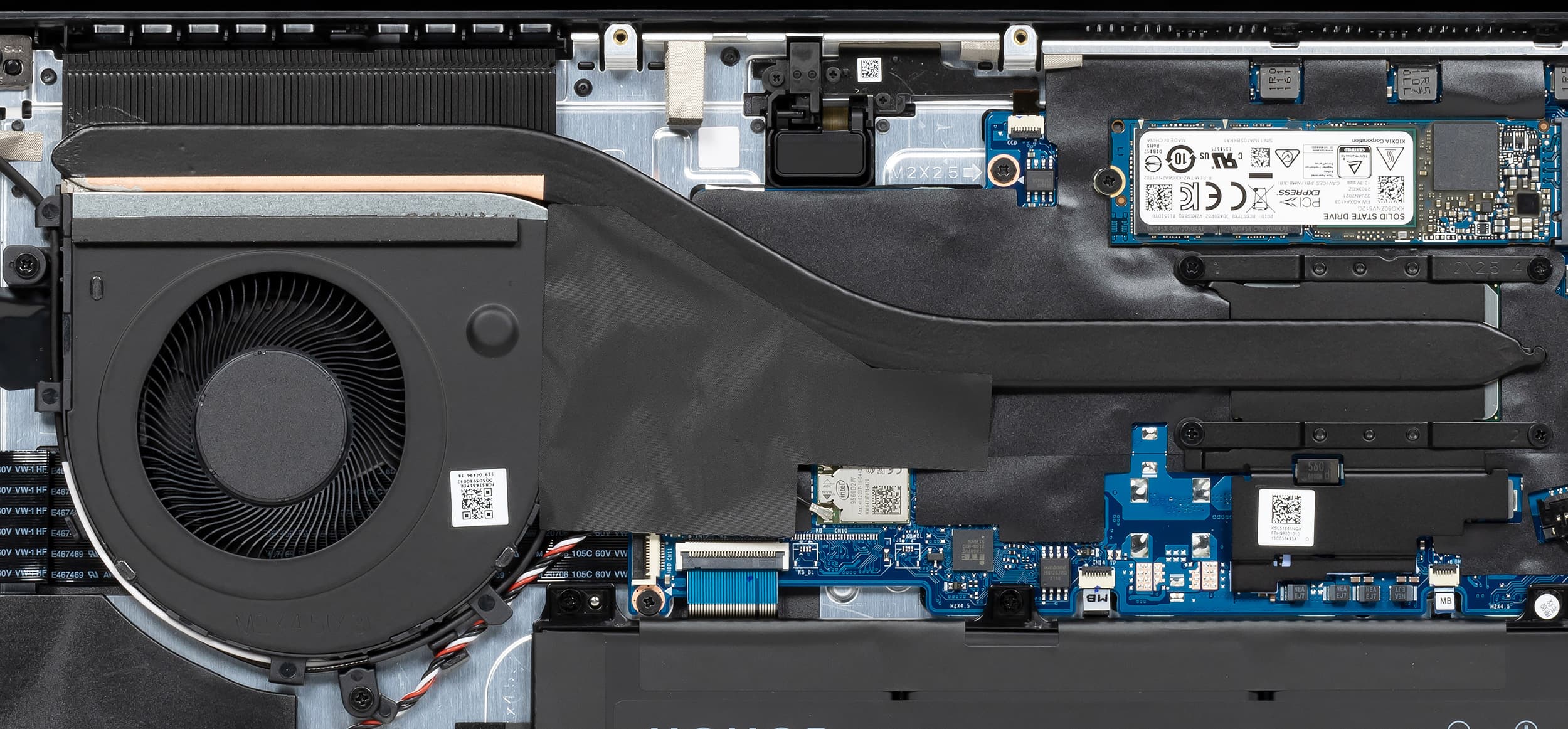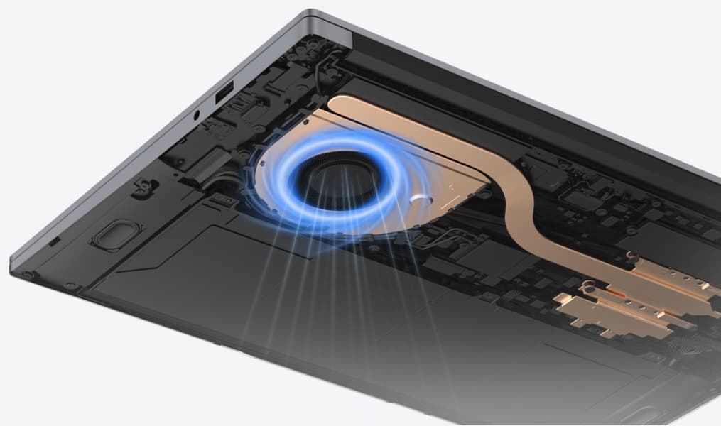 Одна тепловая трубка передает тепло от ядра процессора и его графики на медный радиатор, который охлаждается вентилятором с лопастями в форме акульих плавников.