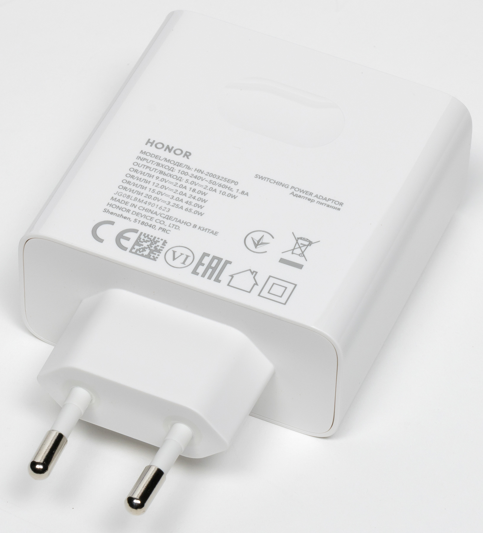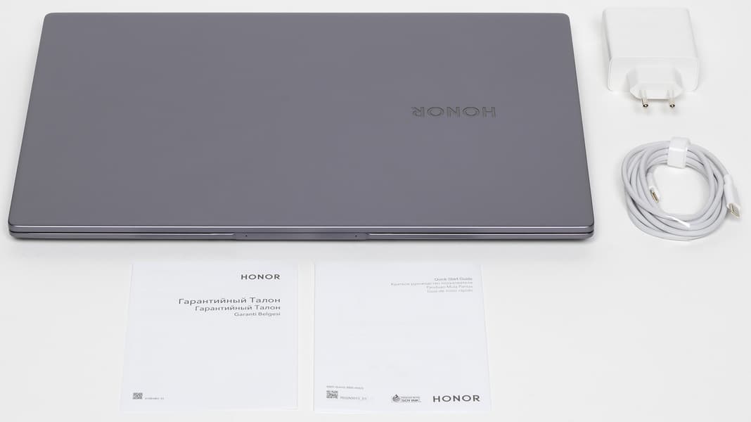 Honor MagicBook X 15 комплектуется компактным адаптером питания массой всего 155 г. Модель адаптера — HN-200325EP0, мощность — 65 ватт (20,0 В, 3,25 А). То есть это стандартный «зарядник» ноутбуков Honor.