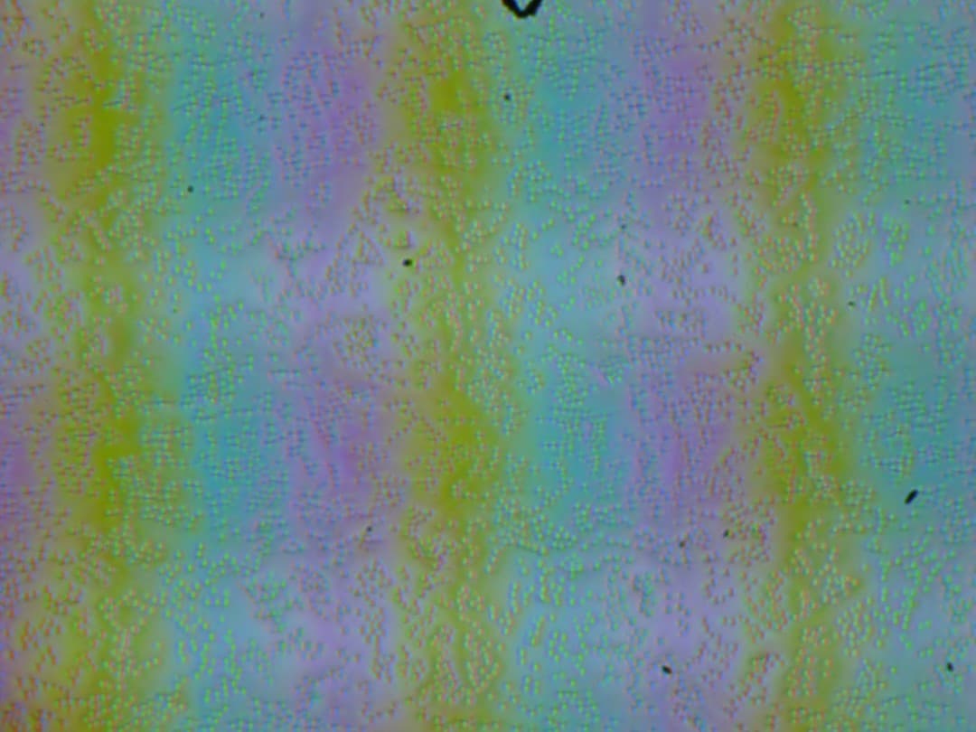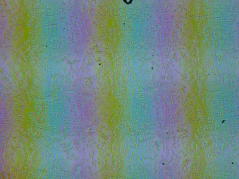 Зерно этих дефектов в несколько раз меньше размеров субпикселей (масштаб этих двух фотографий примерно одинаковый), поэтому фокусировка на микродефектах и «перескок» фокуса по субпикселям при изменении угла зрения выражены слабо, из-за этого нет и «кристаллического» эффекта.