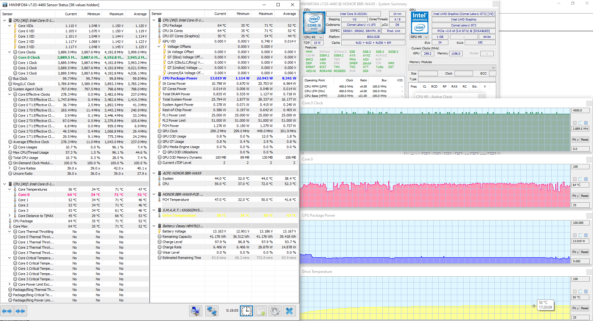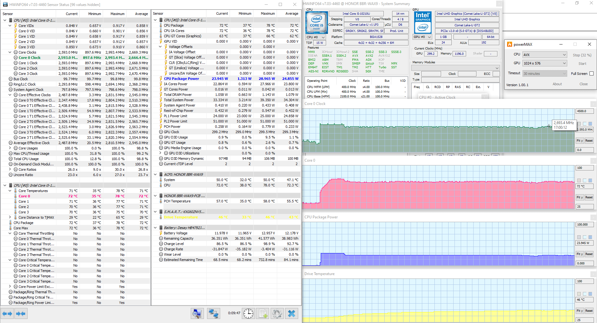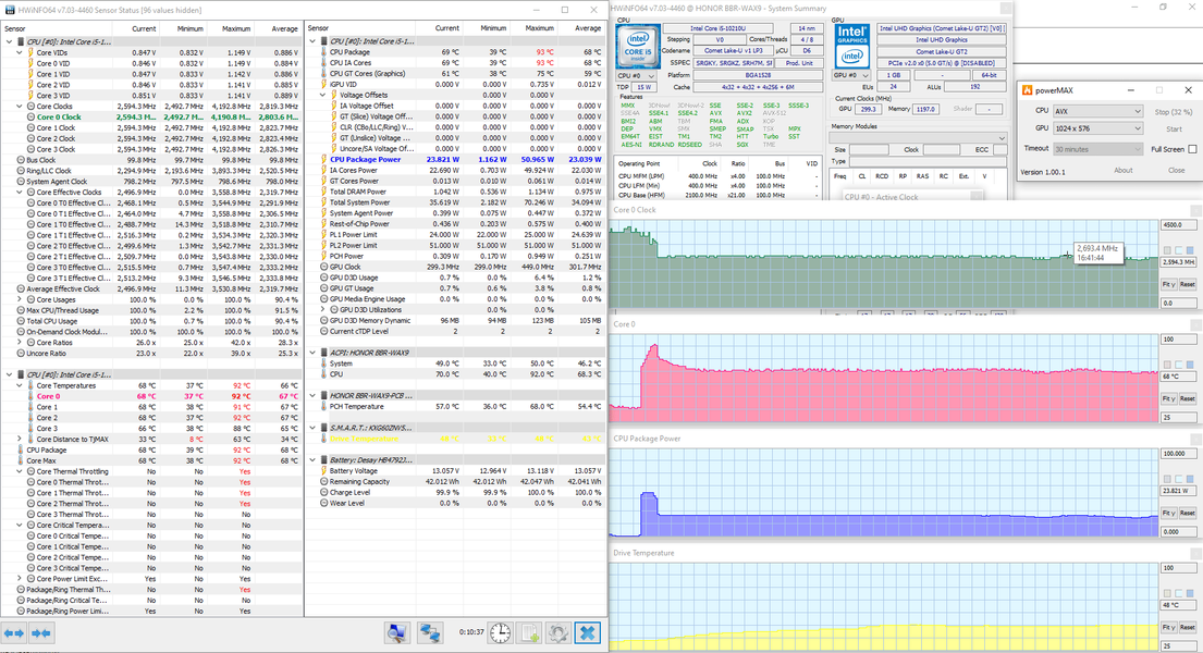 Температурный режим Honor MagicBook X 15 мы проверили в стресс-тесте powerMax (с AVX-инструкциями) при питании от комплектного адаптера, а также при питании от аккумулятора. Мониторинг осуществлялся с помощью утилиты HWinfo, температура в помещении во время теста составляла 27 °C.