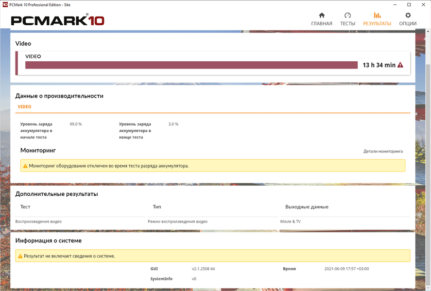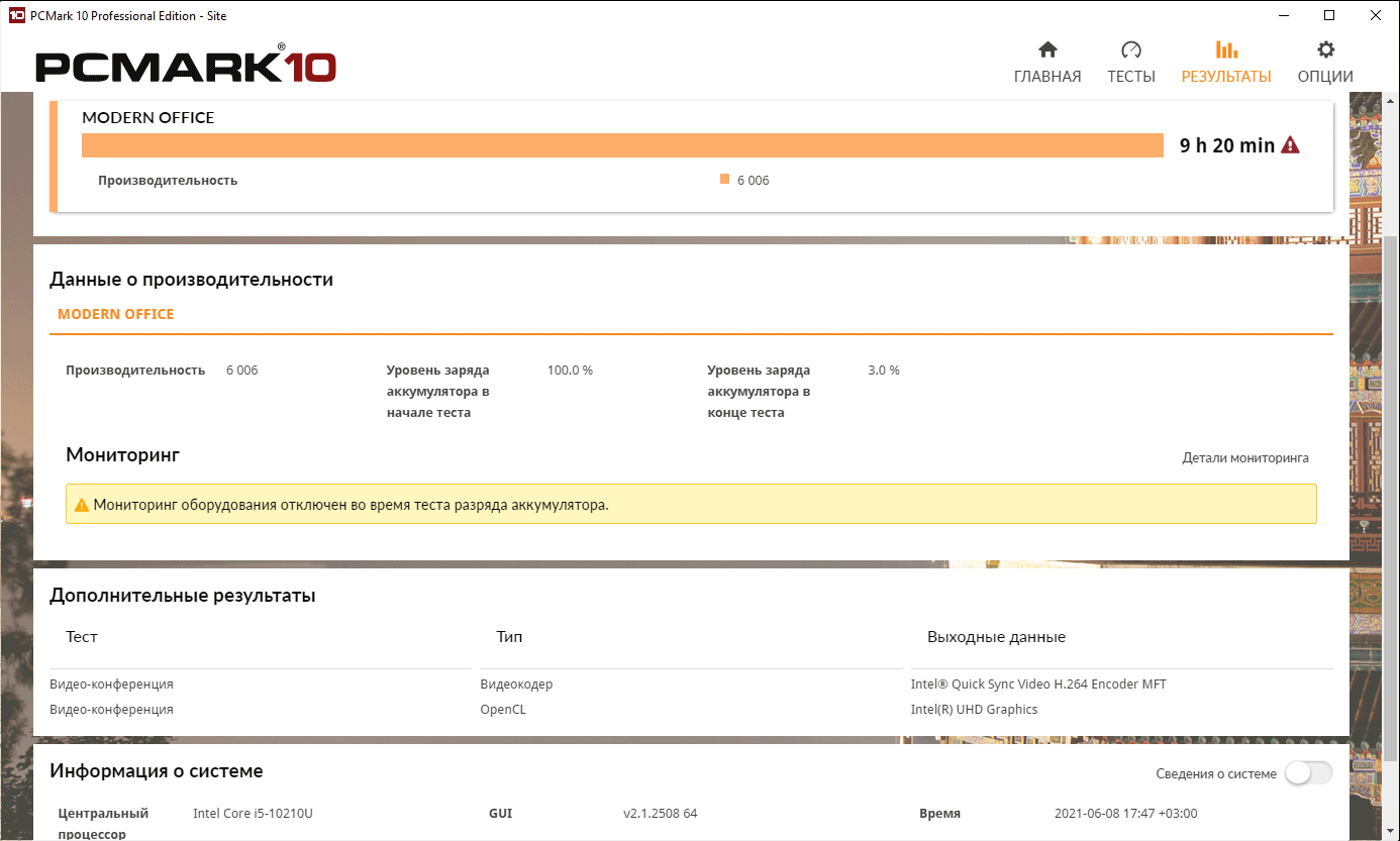 Что же касается автономности, то у Honor MagicBook X 15 с ней все в порядке. В спецификациях указано, что ноутбук должен проработать 7 часов при воспроизведении видео, но он превзошел этот показатель почти вдвое. Мы протестировали автономность MagicBook X 15 в тестовом пакете PCMark’10 при яркости экрана 100 кд/м² (что в данном случае эквивалентно 57% по шкале яркости) и получили следующие результаты.