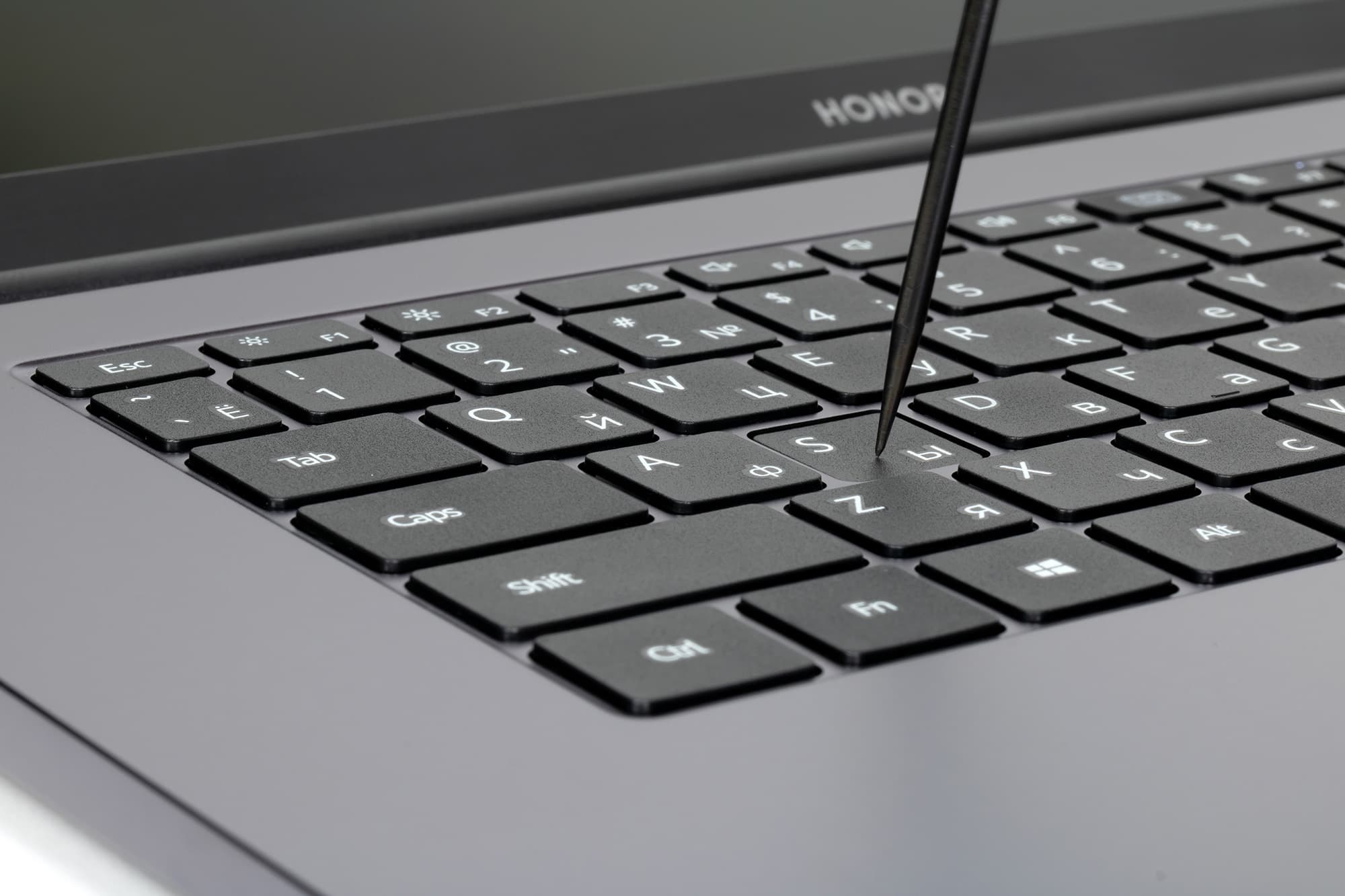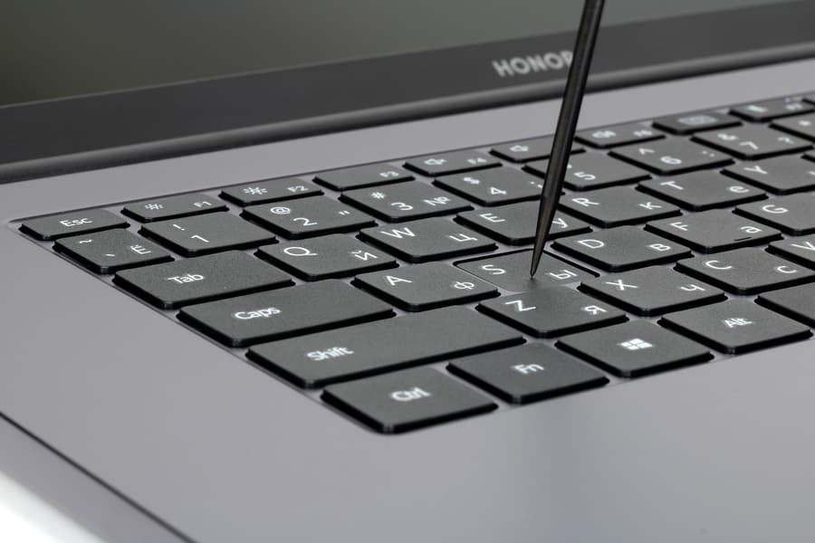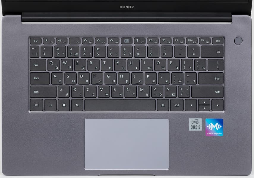 Honor MagicBook X 15 оснащается клавиатурой мембранного типа без блока цифровых клавиш и даже без столбика с клавишами PgUp и PgDn. Это довольно странное решение, поскольку расстояние от края клавиатуры до края корпуса с обеих сторон составляет 38,5 мм, что в сумме дает 77 мм и позволяет спокойно разместить даже цифровой блок.