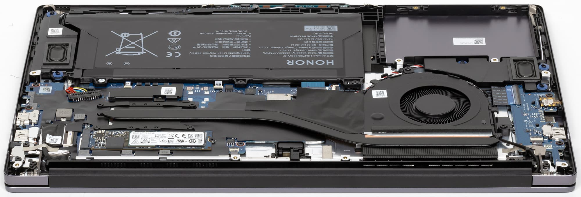 К сожалению, набор портов мы не можем назвать оптимальным, поскольку нет ни одного реально быстрого Type-C, и определенно не хватает еще одного USB 3.0. Нет и картовода, но это полезное устройство Honor в своих ноутбуках по каким-то причинам всегда игнорирует.