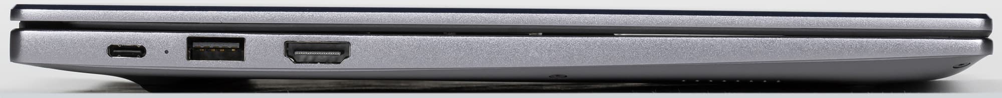 Порты традиционно размещены на боковых сторонах корпуса. Слева выведен единственный USB Type-C интерфейса 2.0 с индикатором зарядки ноутбука (без поддержки обратной зарядки), порт USB 2.0 и видеовыход HDMI, а справа — «миниджек» для наушников и микрофона, а также единственный быстрый порт USB 3.0 Type-A.