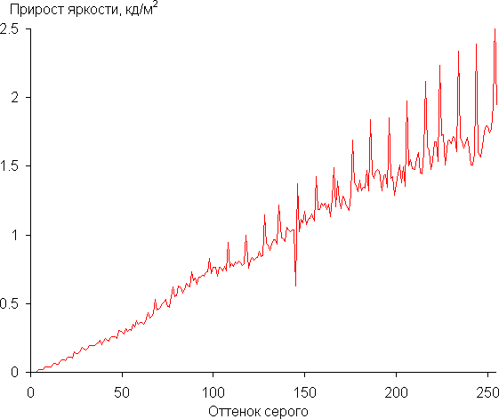 Далее мы измерили яркость 256 оттенков серого (от 0, 0, 0 до 255, 255, 255) при настройках по умолчанию. График ниже показывает прирост (не абсолютное значение!) яркости между соседними полутонами: