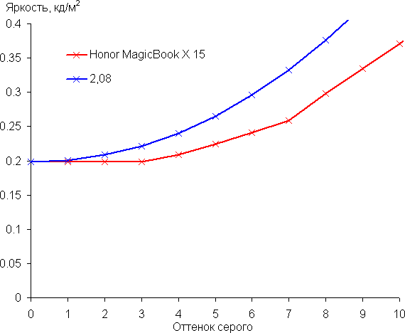 Аппроксимация полученной гамма-кривой дала показатель 2,08, что немного ниже стандартного значения 2,2. При этом реальная гамма-кривая мало отклоняется от аппроксимирующей степенной функции: