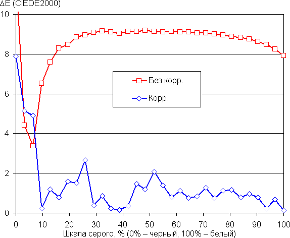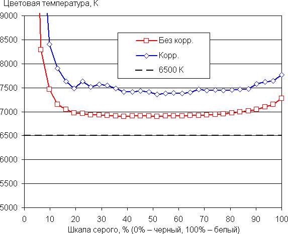 При настройках по умолчанию баланс оттенков на шкале серого хороший (графики Без корр. на рисунках ниже), так как цветовая температура не сильно выше стандартных 6500 К, и отклонение от спектра абсолютно черного тела (ΔE) ниже 10, что для потребительского устройства считается приемлемым показателем. При этом цветовая температура и ΔE мало изменяются от оттенка к оттенку — это положительно сказывается на визуальной оценке цветового баланса (самые темные области шкалы серого можно не учитывать, так как там баланс цветов не имеет большого значения, да и погрешность измерений цветовых характеристик на низкой яркости большая).