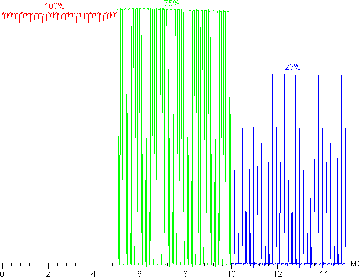 Яркость регулируется с помощью ШИМ, однако частота модуляции очень высокая, порядка 6 кГц, поэтому никакого мерцания не видно ни при каких обстоятельствах, также наличие модуляции не выявляется в тесте на стробоскопический эффект. Приведем графики зависимости яркости (вертикальная ось) от времени (горизонтальная ось) при различных значениях настройки яркости:
