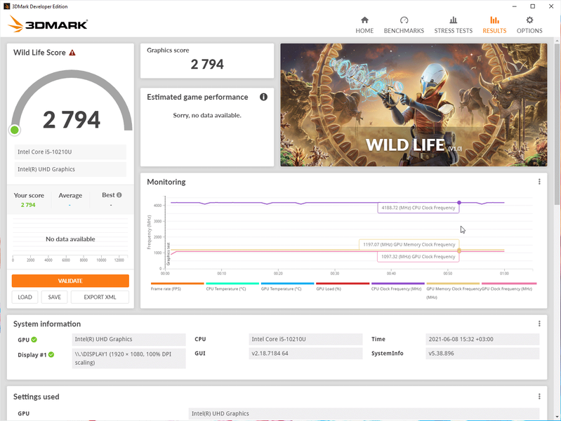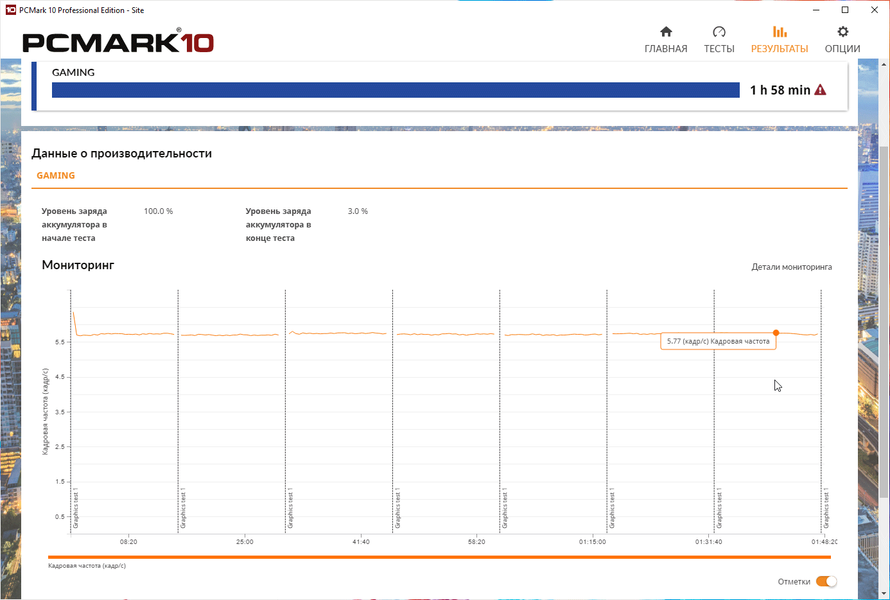 В тесте Modern Office ноутбук проработал 9 часов и 20 минут, в условном игровом режиме — почти 2 часа, а вот видео он смог воспроизводить 13 с половиной часов! Что же касается теста PCMark’10 Application, эмулирующего работу с офисными приложениями, то он дважды завершался с ошибкой по истечении 11 часов теста, и в обоих случаях оставалось еще 8% емкости аккумулятора. Это, на наш взгляд, очень неплохие показатели для такого ноутбука с небольшой батареей.