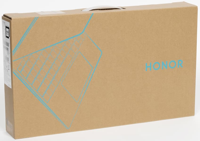Ноутбук поставляется в плоской картонной коробке размерами 474×280×68 мм и весом 2,23 кг с пластиковой ручкой для переноски. С торца коробки есть информационный стикер, из которого можно сразу узнать о конфигурации ноутбука.