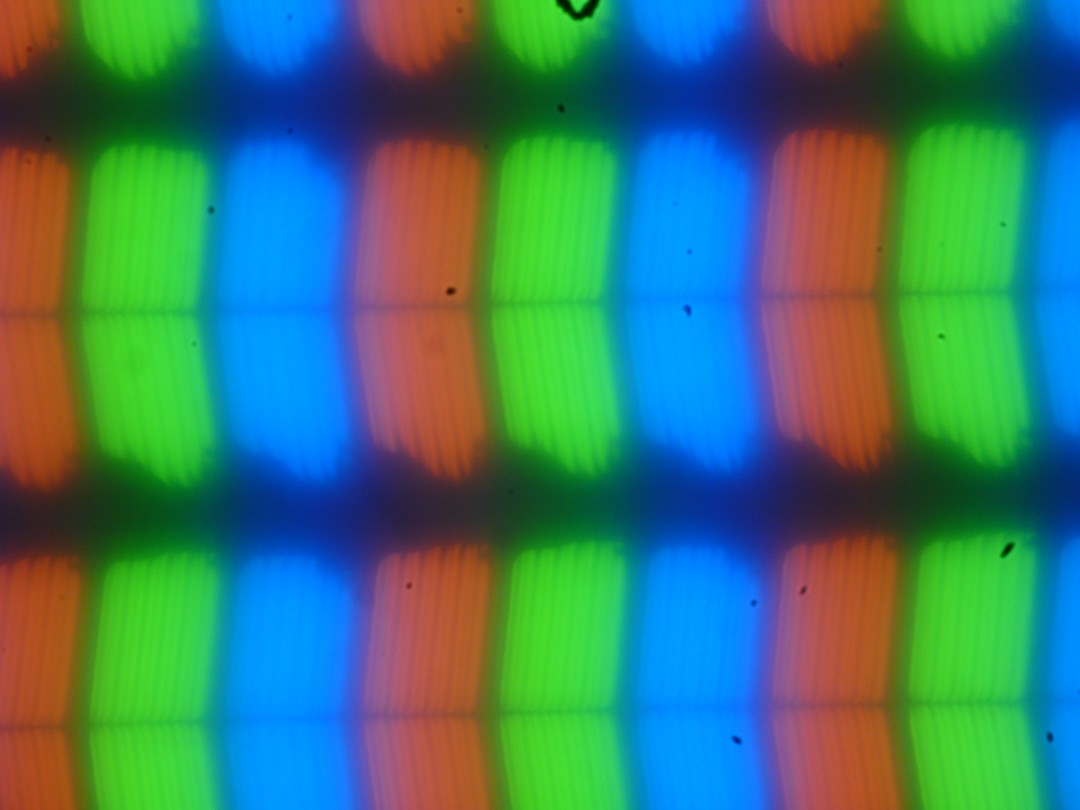 В этом ноутбуке используется матрица типа IPS. Микрофотографии демонстрируют типичную для IPS структуру субпикселей (черные точки — это пыль на матрице фотоаппарата):