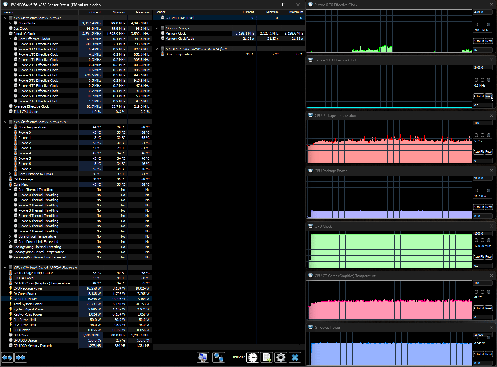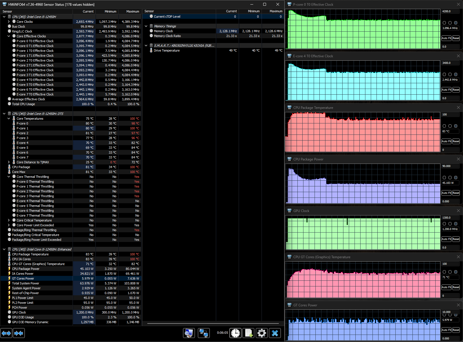 В ноутбуке установлен процессор 12-го поколения Intel Core i5-12450H (кодовое наименование Alder Lake, выпускается с начала 2022 года). У него 8 ядер, из них четыре Performance cores (P-cores, производительные), которые могут работать в два потока на частотах до 4,4 ГГц, и столько же однопоточных энергоэффективных Efficient cores (E-cores, до 3,3 ГГц), то есть максимальное количество потоков будет двенадцать.