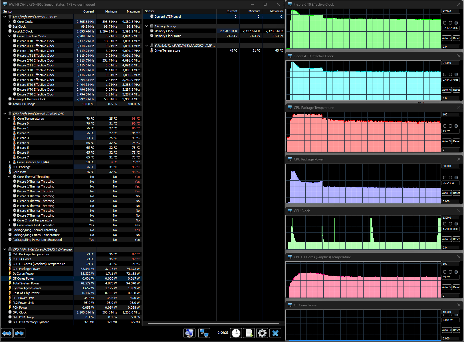 Базовый TDP процессора составляет 45 Вт, но может изменяться в пределах от 35 до 95 ватт (в режиме Turbo) — это по официальной спецификации, в нашем случае в предшествующих тестах длительное потребление как раз и дотягивало до базовых 45 ватт, а пиковые значения в 80 Вт были хоть и меньше обозначенного максимума, но разница не огромная, то есть нельзя сказать, что разработчики ноутбука «притормозили» процессор.
