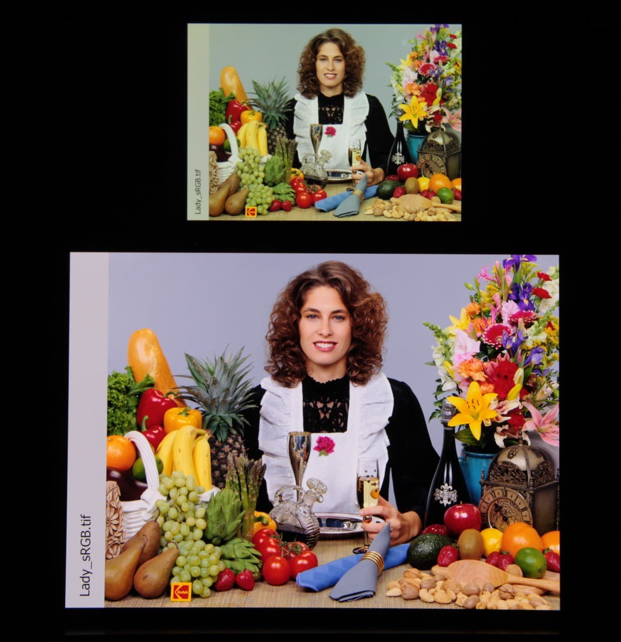 Цветопередача хорошая, цвета в меру насыщенные, цветовой баланс у экранов немного различается. Напомним, что фотография не может служить надежным источником сведений о качестве цветопередачи и приводится только для условной наглядной иллюстрации. В частности, выраженный красноватый оттенок белого и серого полей, присутствующий на фотографиях OLED-экрана, при перпендикулярном взгляде визуально отсутствует, что подтверждается аппаратными тестами с помощью спектрофотометра. Причина в том, что спектральная чувствительность матрицы фотоаппарата неточно совпадает с этой характеристикой человеческого зрения.