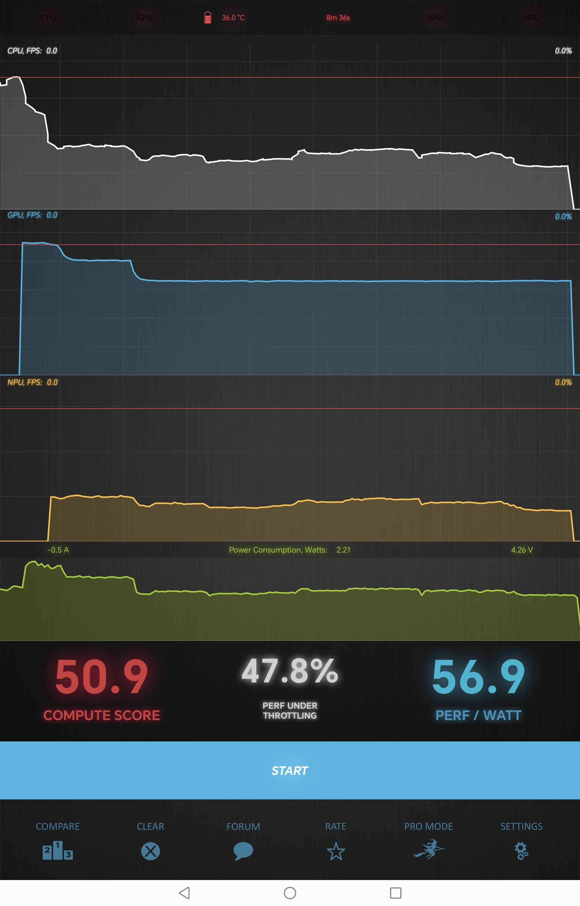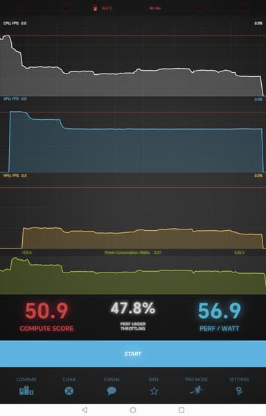 Правда, при длительном интенсивном использовании падение производительности может быть достаточно велико: ниже 48%, о чем свидетельствует Burnout Benchmark, нагружающий SoC в течение десяти минут и замеряющий уровень троттлинга.