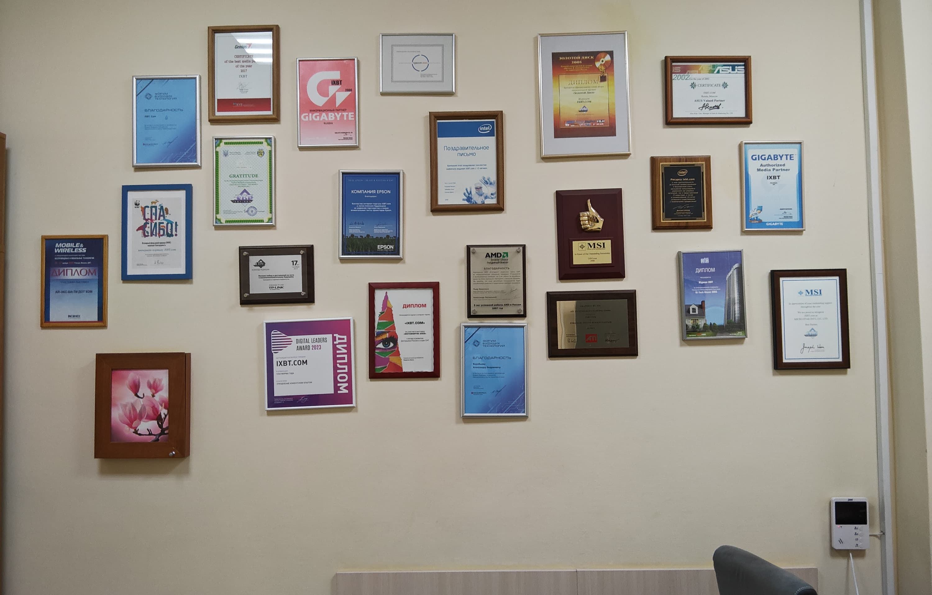 Изображение шумноватое и местами нерезкое, но при этом на фотографии с парковки можно разобрать (пусть и с трудом) номера стоящих вдали машин, а на снимке с дипломами iXBT.com — названия компаний. Такой результат мы встречаем у камер планшетов нечасто. Еще одно преимущество — хорошая работа с макро. Оцените красивое размытие на фото с елочкой.