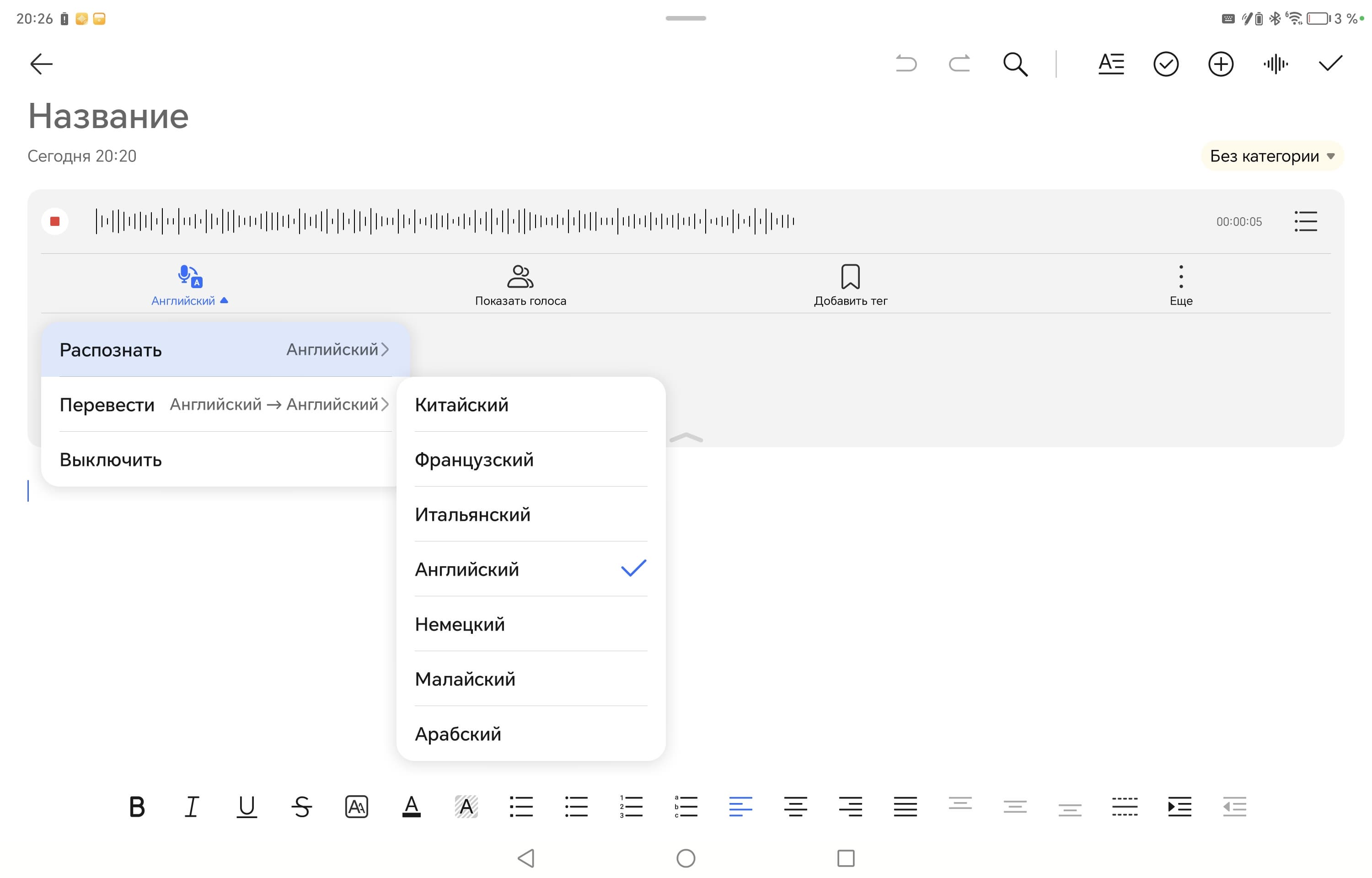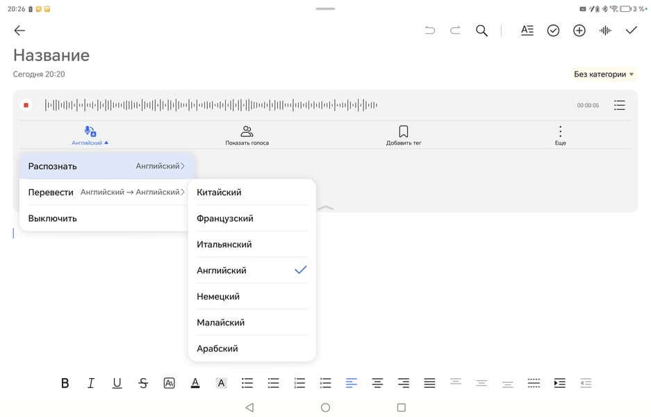 Из важных программных новшеств отметим следующее. Во-первых, распознавание голоса в заметках: можно надиктовать сообщение и увидеть его в письменном виде. Увы, пока русский язык там не доступен — поддерживаются английский, ряд других европейских языков, китайский, малайский и арабский. Но простые фразы на английском планшет распознаёт неплохо.