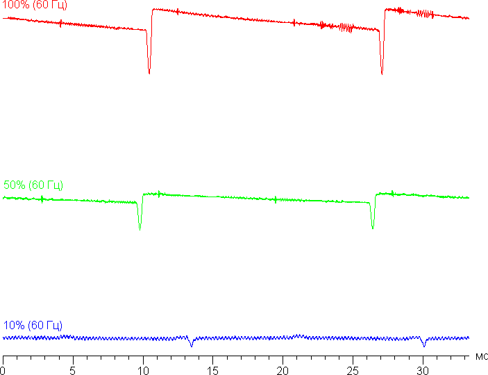 На высоком и среднем уровне яркости присутствует значимая модуляция с частотой 60, 90 или 120 Гц. На рисунках ниже приведены зависимости яркости (вертикальная ось) от времени (горизонтальная ось) для нескольких значений настройки яркости. Сначала для режима с частотой обновления 60 Гц: