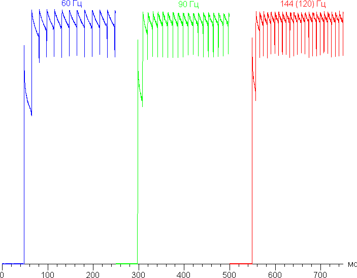 Но по факту максимальная частота составляет 120 Гц. Возможно, режим с заявленной частотой 144 Гц появится после обновления прошивки.