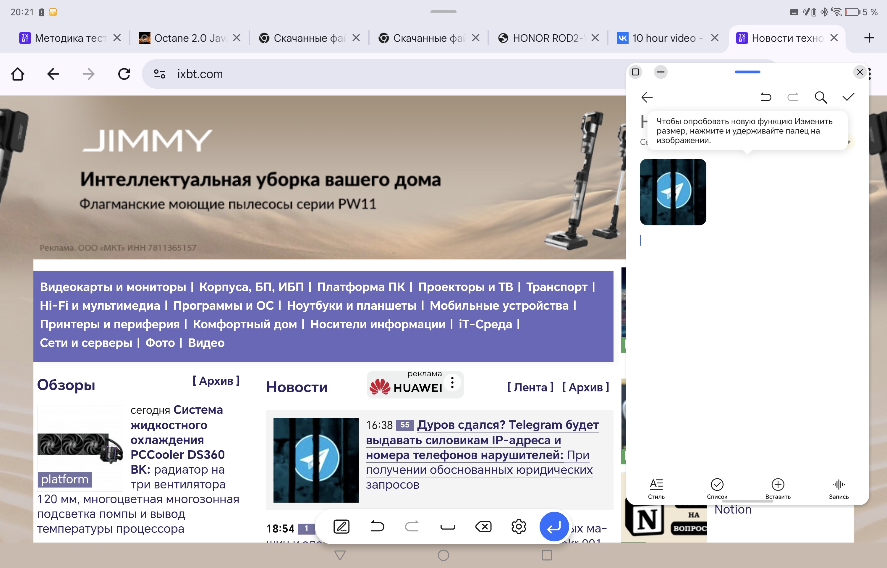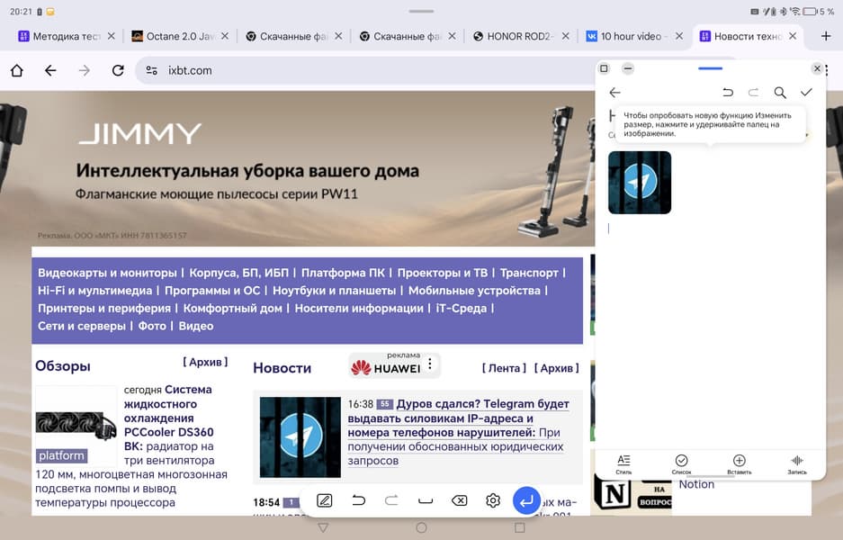Во-вторых, опция Magic Portal. Идея в том, что вы можете выделить или захватить стилусом какой-то контент, например картинку на сайте, перетянуть ее к левой части экрана и закинуть в другое приложение — скажем, в Заметки. Раньше для этого нужно было сохранять изображение, переключаться на другое приложение, вставлять туда сохраненный файл. Теперь всё это делается буквально в одно движение.