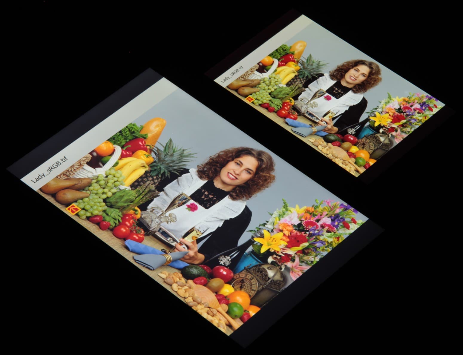 Экран имеет хорошие углы обзора без значительного сдвига цветов даже при больших отклонениях взгляда от перпендикуляра к экрану и без инвертирования оттенков. Для сравнения приведем фотографии, на которых на экраны Honor Pad X8 и Nexus 7 выведены одинаковые изображения, при этом яркость экранов изначально установлена примерно на 200 кд/м², а цветовой баланс на фотоаппарате принудительно переключен на 6500 К.