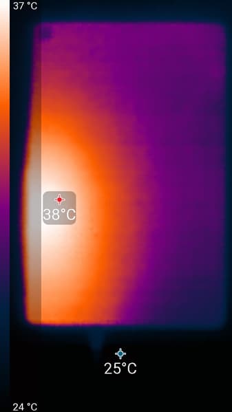 Нагрев больше в правой части аппарата, что, видимо, соответствует расположению микросхемы SoC. По данным теплокамеры, максимальный нагрев составил 38 градусов (при температуре окружающего воздуха в 24 градуса), это умеренный нагрев в случае данного теста.