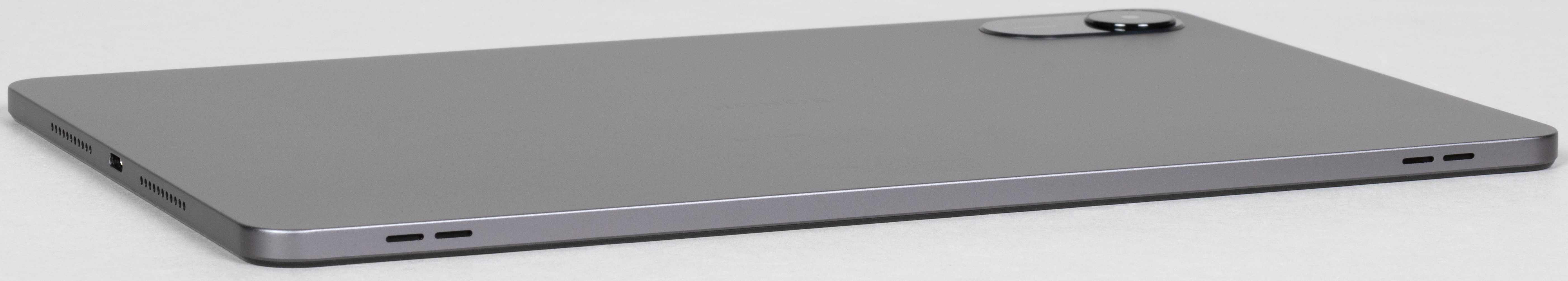 Тонкий корпус представляет собой цельную металлическую деталь, в которую вставлена стеклянная площадка с модулем камеры. Площадка довольно большая, и это явно декоративное решение, поскольку ни вспышки, ни второй камеры здесь нет. Так что можно было сделать этот элемент гораздо компактнее, но производитель решил, видимо, подчеркнуть фотовозможности планшета, и прежде всего — доработку снимков камеры с помощью AI.