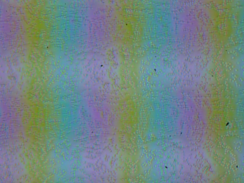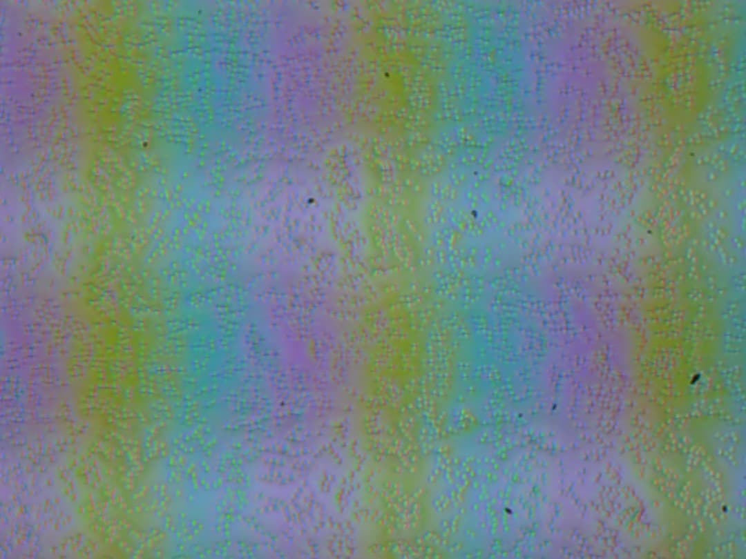 Зерно этих дефектов в несколько раз меньше размеров субпикселей (масштаб этих двух фотографий примерно одинаковый), поэтому фокусировка на микродефектах и «перескок» фокуса по субпикселям при изменении угла зрения выражены слабо, из-за этого нет и «кристаллического» эффекта.