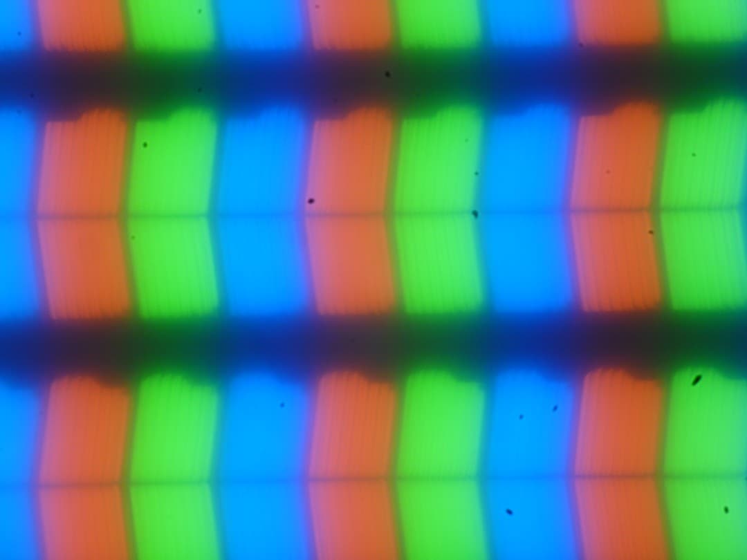 В этом ноутбуке используется матрица типа IPS. Микрофотографии демонстрируют типичную для IPS структуру субпикселей (черные точки — это пыль на матрице фотоаппарата):