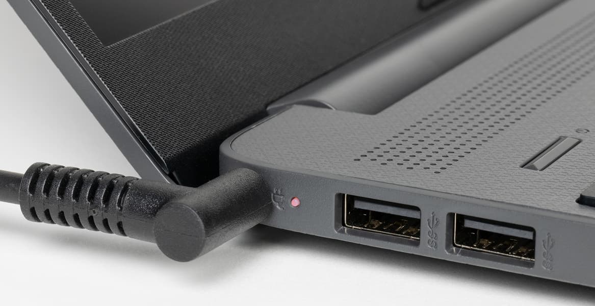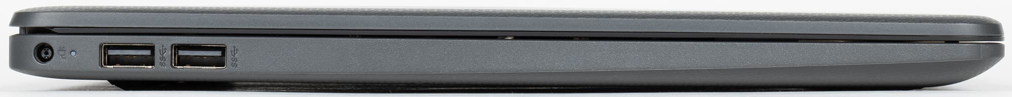 В задней части левого бока ноутбука расположены разъем для подключения адаптера питания с индикатором (оранжевый во время зарядки, белый при полном заряде, мигает при низком остатке заряда) и пара портов USB 3.1 Gen1 Type-A.