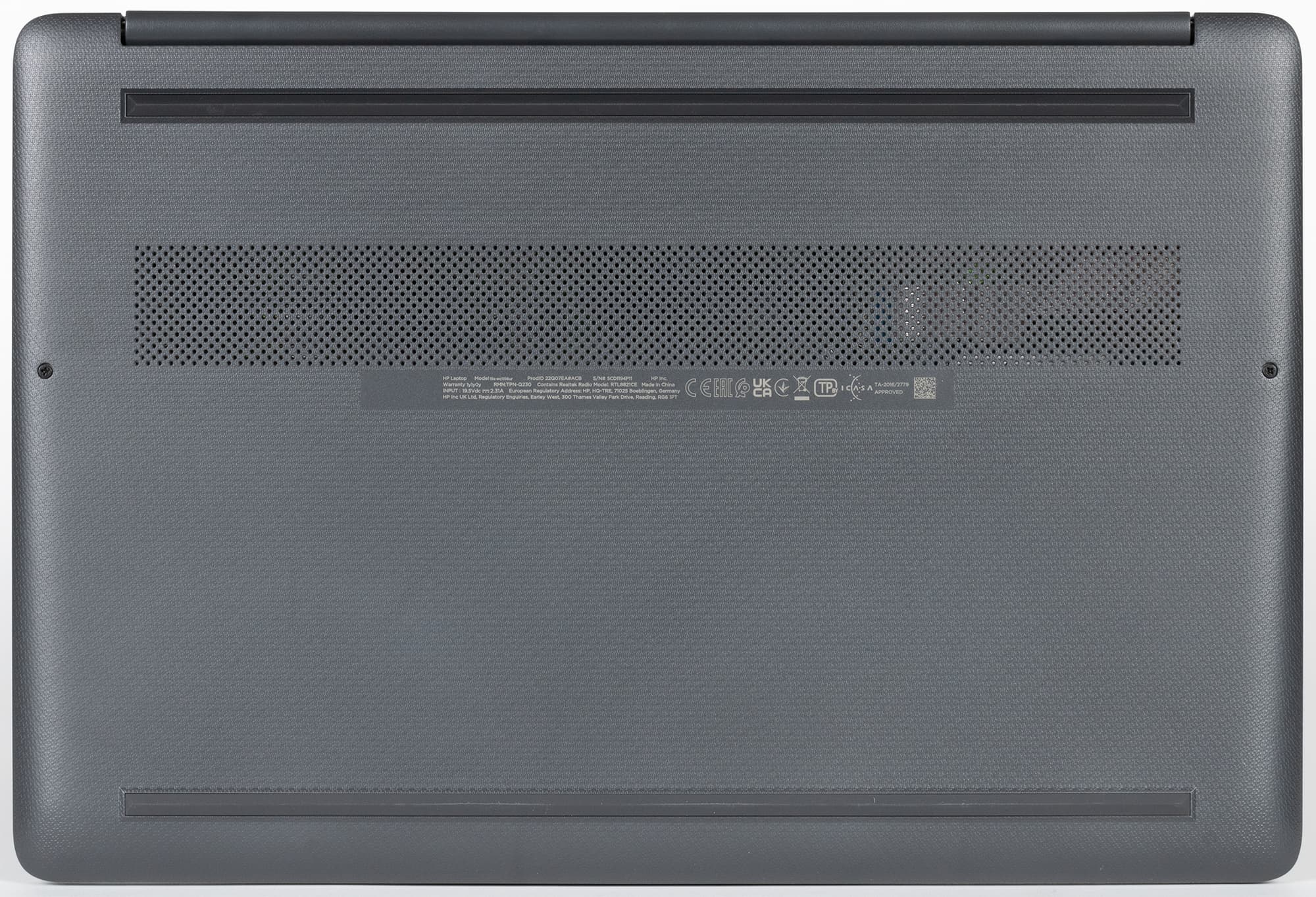 На днище, ближе к задней кромке, имеется область с вентиляционными отверстиями (сама эта область не очень большая, а отверстия мелкие, но их очень много). Через них происходит забор воздуха для охлаждения компонентов, поэтому ставить ноутбук на мягкую поверхность не следует.