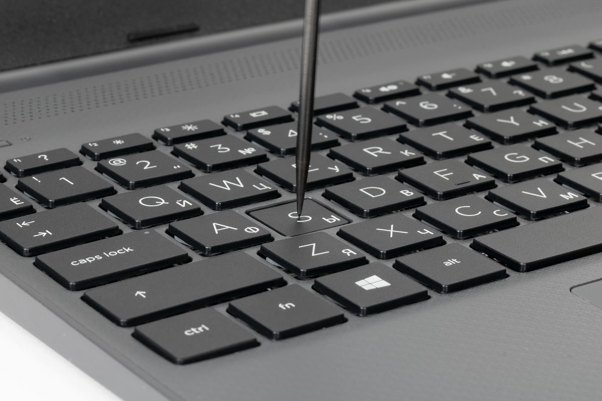 Основные клавиши нормального размера (15×15 мм), обе клавиши Shift широкие, но не одинаковые — правая немного шире. Расстояние между центрами клавиш в одном ряду составляет 19 мм, между их краями — 4 мм. Печатать вполне комфортно, звуки при печати не слишком громкие. Полный ход клавиш составляет, по нашему замеру, 1,3 мм.