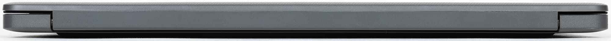 Толщина ноутбука хоть и не рекордно малая, но очень небольшая: максимум приходится на заднюю часть, где наш замер показал 18,5 мм. Спереди чуть меньше — на неполный миллиметр, хотя зрительно кажется, что к передней кромке аппарат становится заметно тоньше, но это происходит из-за клиновидной формы боковых торцов.