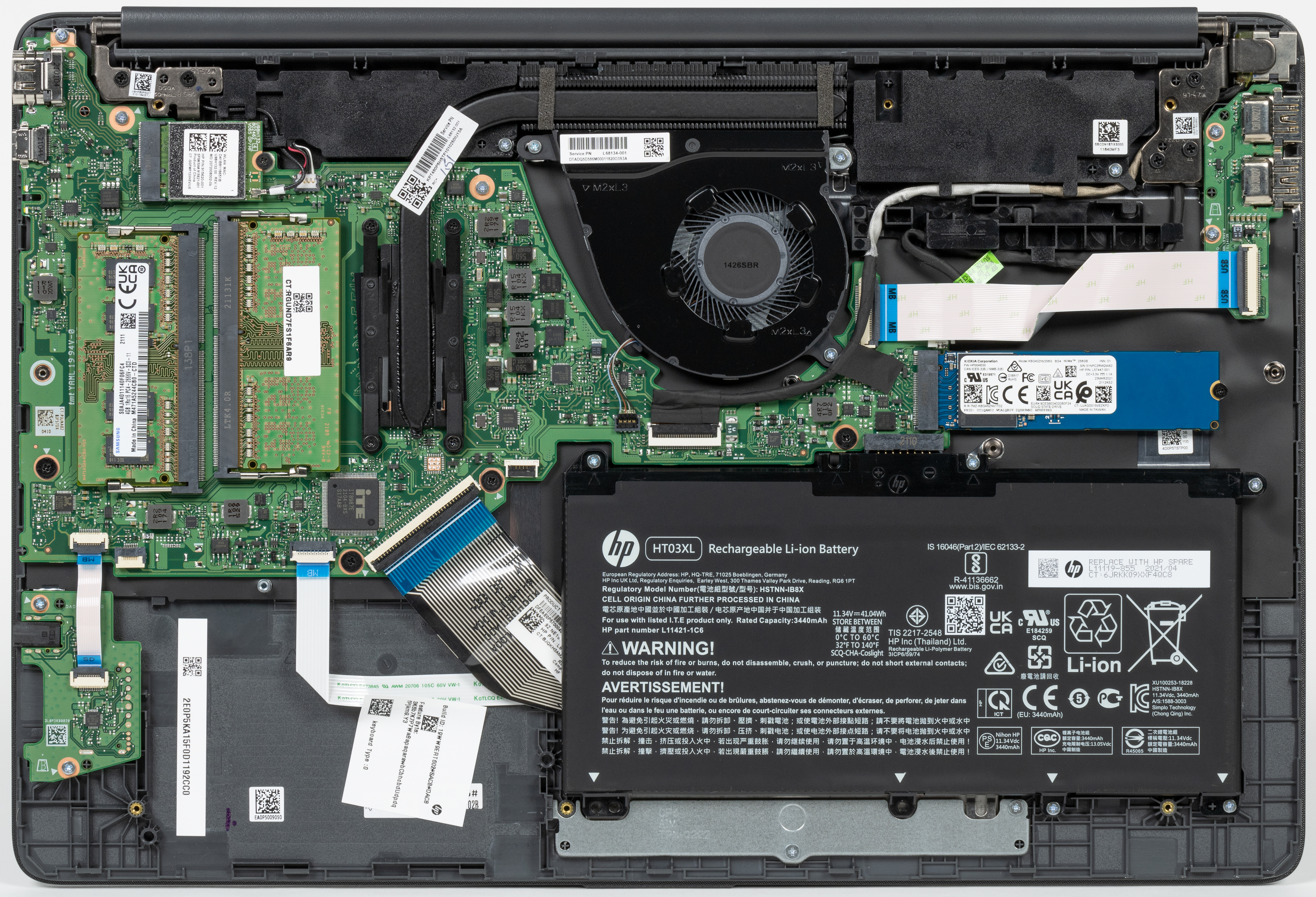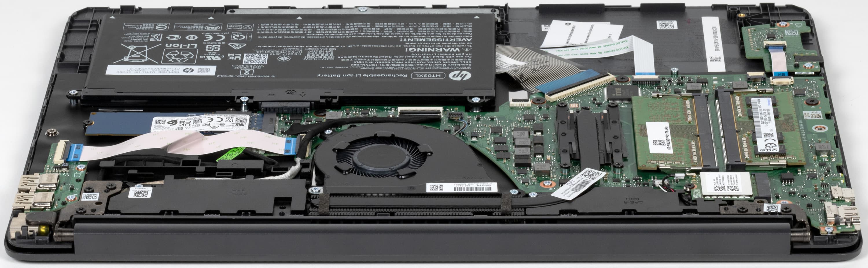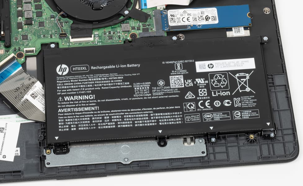 После снятия нижней крышки корпуса открывается доступ к ОЗУ, SSD-накопителю в слоте M.2, батарее, кулеру и беспроводному сетевому адаптеру.