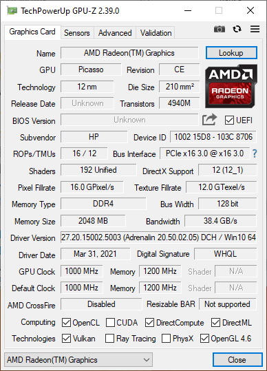 Процессор содержит встроенную графику AMD Radeon Graphics (Radeon RX Vega 3 — 3 ядра, тактовая частота 1000 МГц) и работает с оперативной памятью DDR4-2400 объемом до 32 ГБ в двухканальном режиме.