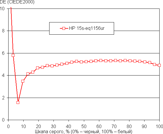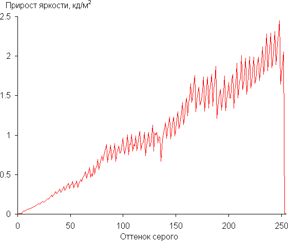 Далее мы измерили яркость 256 оттенков серого (от 0, 0, 0 до 255, 255, 255) при настройках по умолчанию. График ниже показывает прирост (не абсолютное значение!) яркости между соседними полутонами: