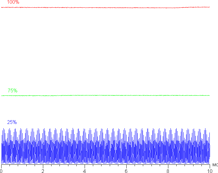 Мерцания (ни видимого, ни выявляемого в тесте на стробоскопический эффект) ни на каком уровне яркости нет. Если подходить совсем строго, то зависимости яркости от времени на низкой яркости выявляют наличие модуляции, но ее характер (частота порядка 24 кГц и небольшая относительно максимальной яркости амплитуда) такой, что никогда и ни при каких условиях мерцание не обнаруживается и не может хоть как-то влиять на зрение пользователя. Приведем графики зависимости яркости (вертикальная ось) от времени (горизонтальная ось) при различных значениях настройки яркости: