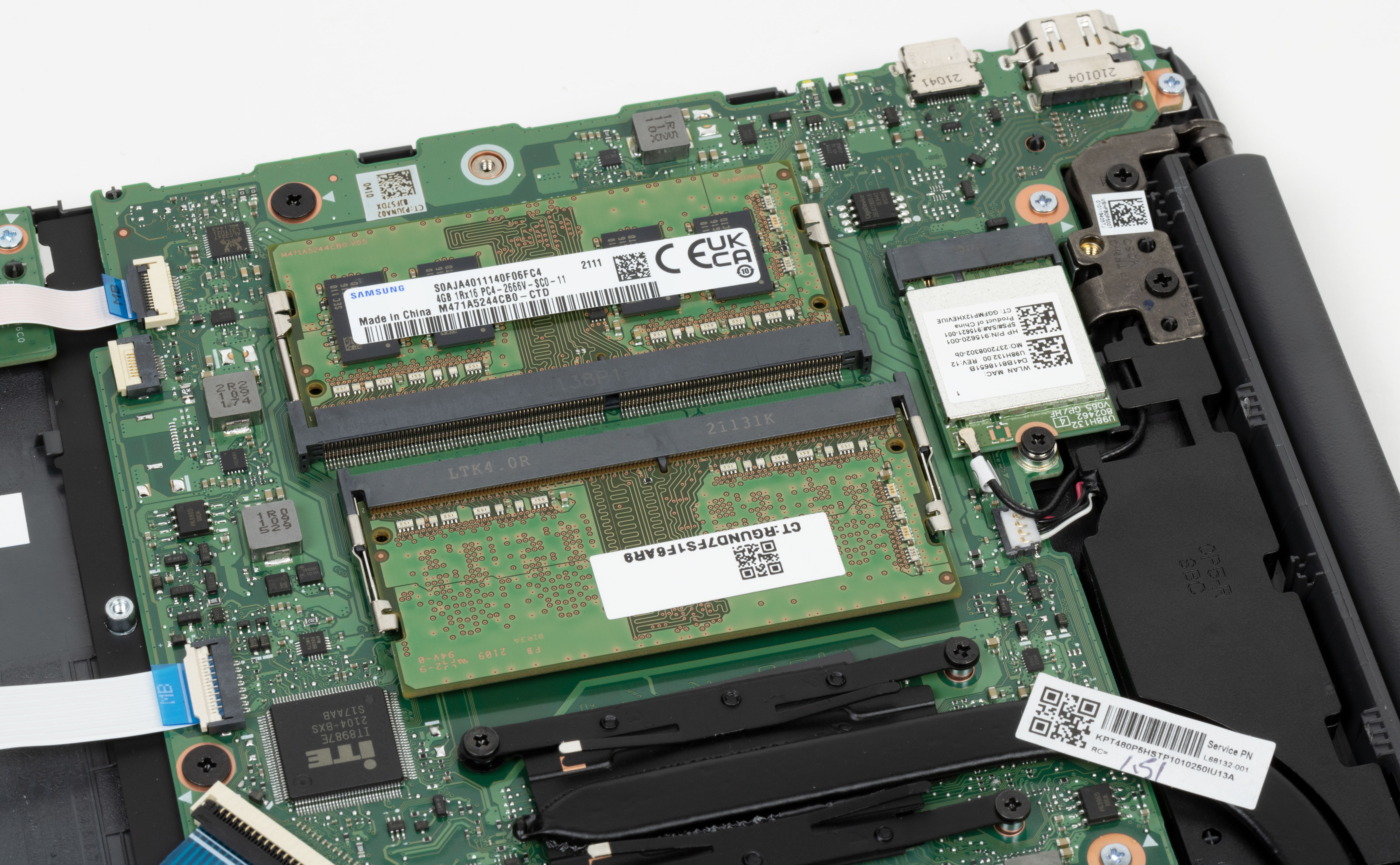 Модули памяти SO-DIMM установлены в слоты, свободных нет — если надо увеличить объем, модули придется менять. Второго слота M.2 также не предусмотрено, еще один накопитель не установишь.