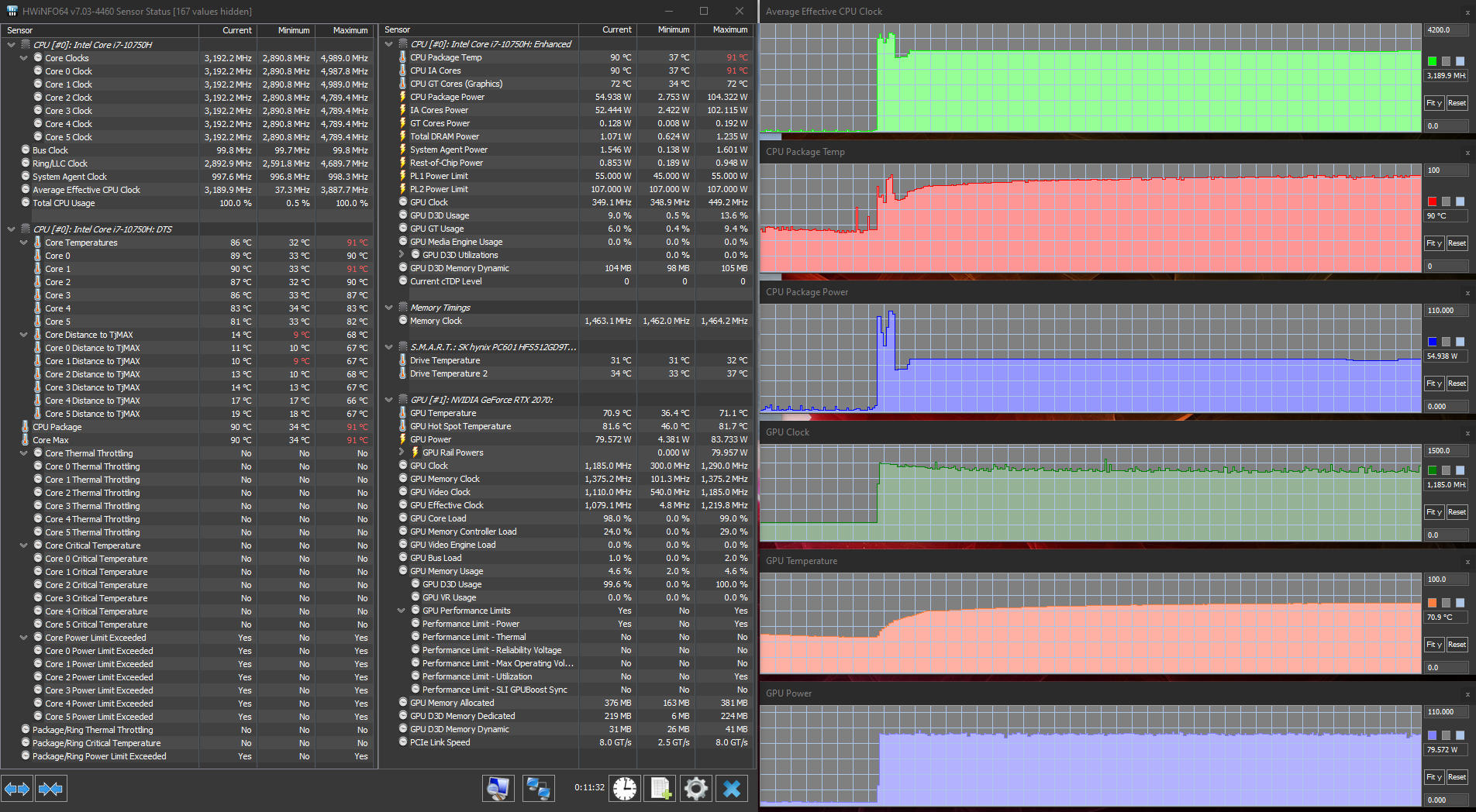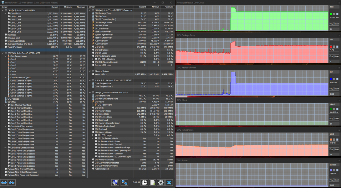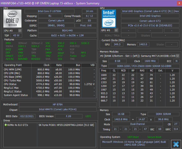 В HP Omen 15-ek0039ur установлен процессор Intel Core i7-10750H прошлого, 10-го поколения (Comet Lake). Это 6-ядерный (12-поточный) процессор с частотой до 5,0 ГГц и с TDP 45 Вт. Как показало тестирование под нагрузкой, процессор в этом ноутбуке всегда работает с повышенным потреблением: в сбалансированном режиме — на 55 Вт, а в производительном — и вовсе на 90 Вт. Сам факт превышения TDP процессора в ноутбуках, мягко говоря, не редкость (в конце концов, эта величина говорит именно о рекомендуемом охлаждении, а оно в каждом ноутбуке свое), но давно ли стало нормой превышать TDP вдвое?? Тем не менее, к стабильности работы процессора даже при 90-ваттном потреблении претензий нет, перегрева и тротлинга тоже нет, так что по факту имеем очень производительный процессор.