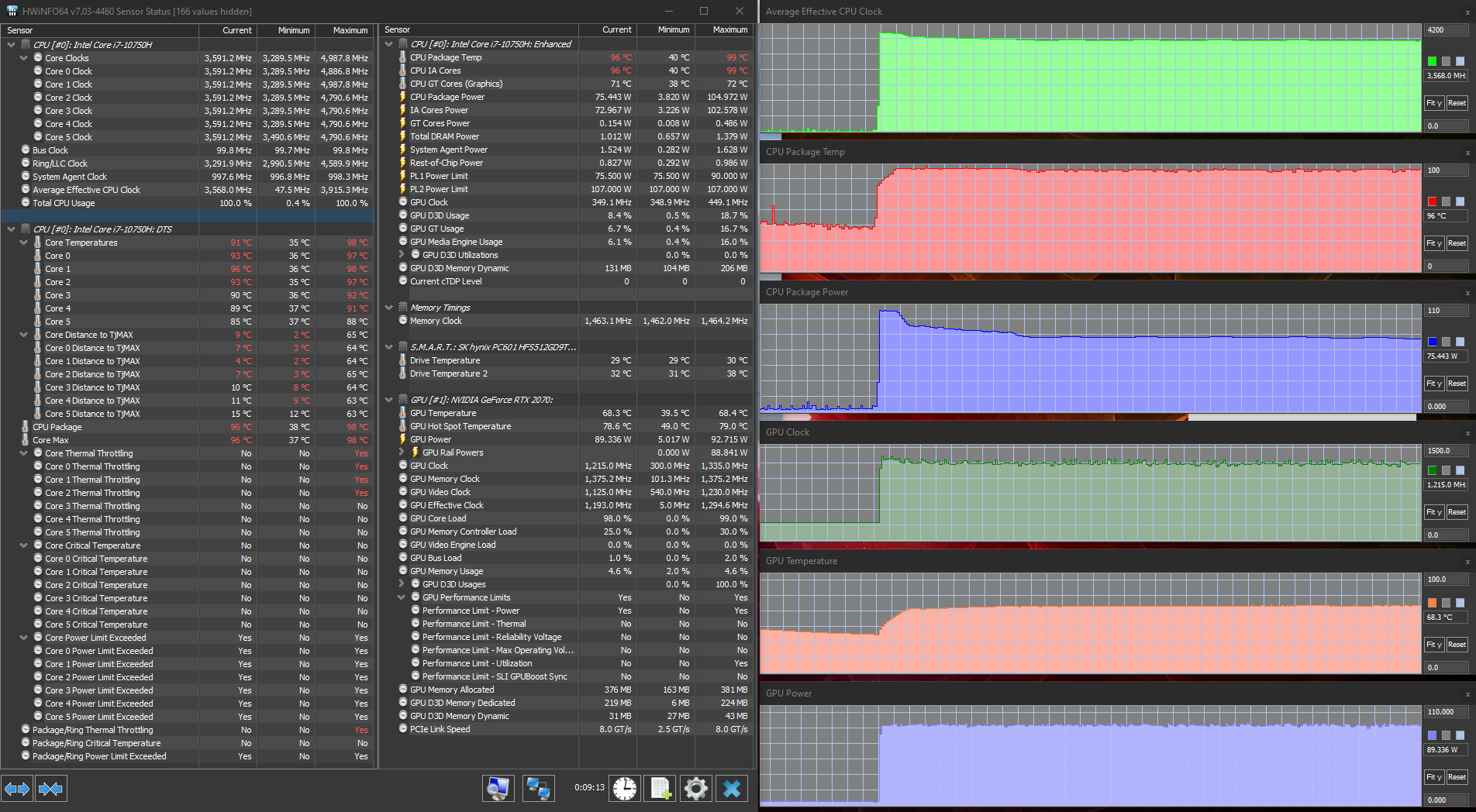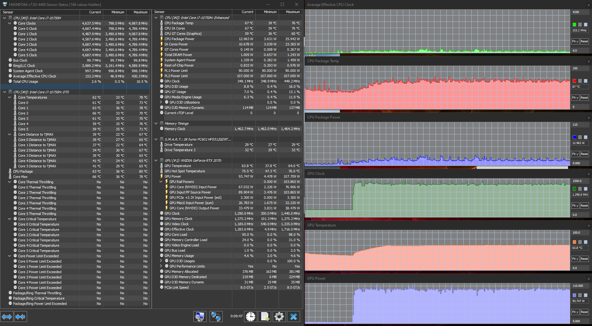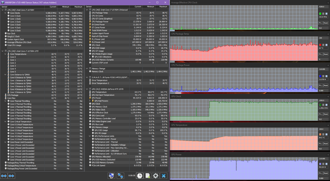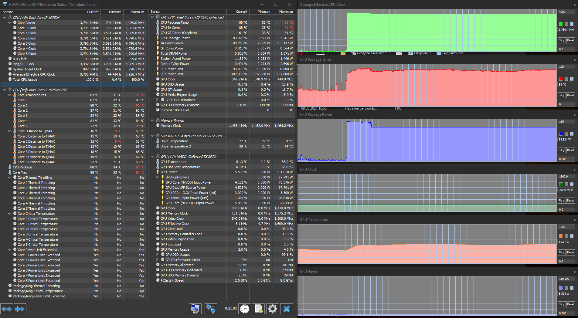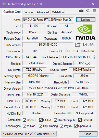 Конечно, тестирование в играх мы в любом случае проведем с использованием дискретной карточки. Nvidia GeForce RTX 2070 относится уже к прошлому поколению (Turing), с 2021 года в игровые ноутбуки ставятся видеокарты GeForce RTX 30 Laptop, в целом более быстрые (и дорогие). Впрочем, доступность таких решений оставляет желать лучшего, так что ноутбуки модельного ряда прошлого года до сих пор совершенно актуальны. В данном случае установлена модификация видеоускорителя Max-Q, оптимизированная по потреблению, то есть у нее выше энергоэффективность. Однако абсолютная производительность при этом, разумеется, ниже. На сайте HP/Omen мы не нашли заявленных характеристик видеокарты, теоретически есть два варианта, с потреблением 80 и 90 Вт, и судя по нашему тестированию под нагрузкой, в HP Omen 15-ek0039ur используется старший вариант, да еще и с дополнительным разгоном (потребление 95 Вт). Для сравнения, у «полноценной» мобильной GeForce RTX 2070 потребление составляет 115 Вт. Частота GPU в тестах составляла примерно 1300 МГц, частота памяти — 11 ГГц.