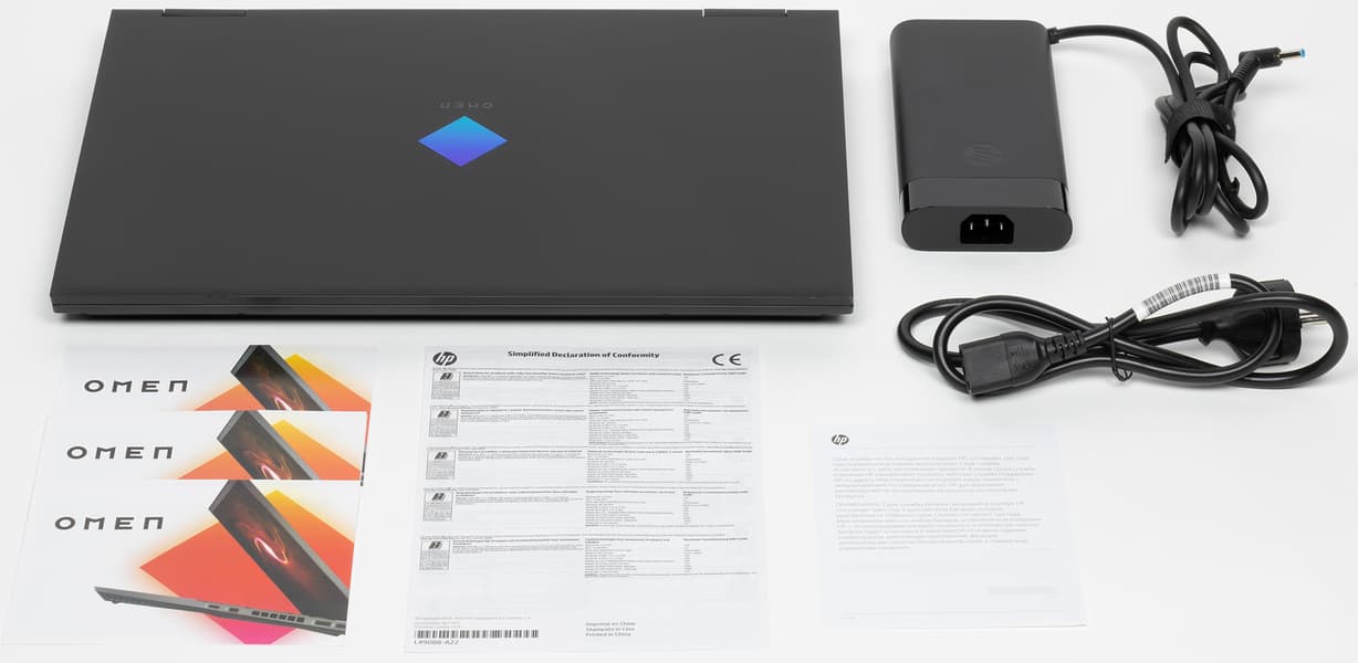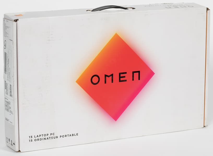 Ноутбук поставляется в белой коробке с ручкой для переноски; единственный яркий элемент оформления — ромб, являющийся фирменным знаком серии Omen.