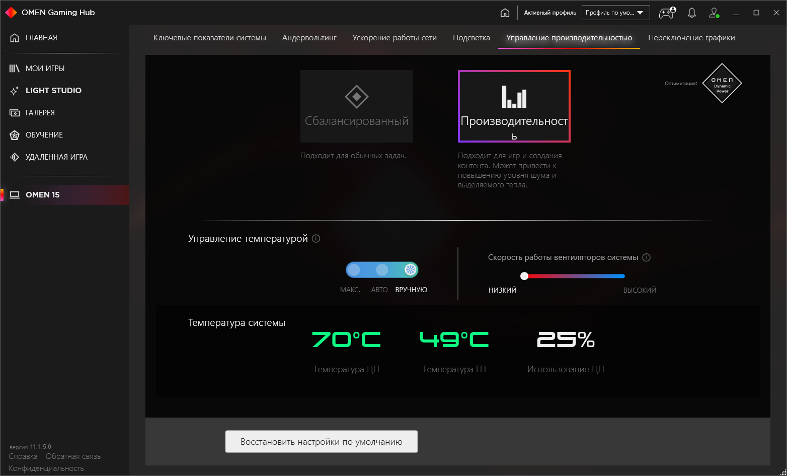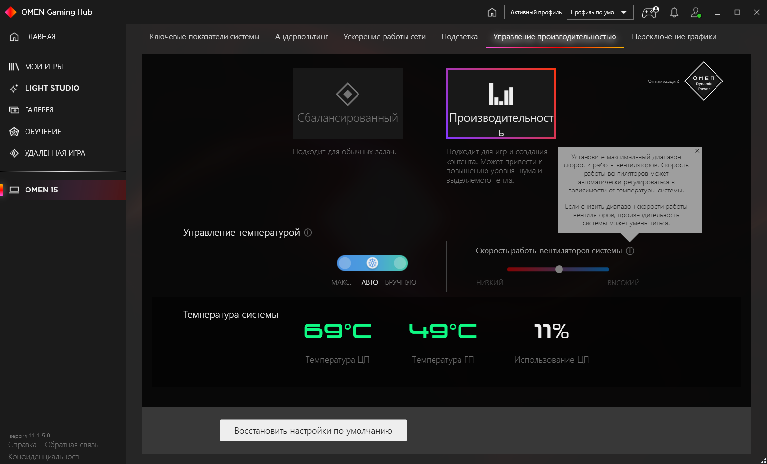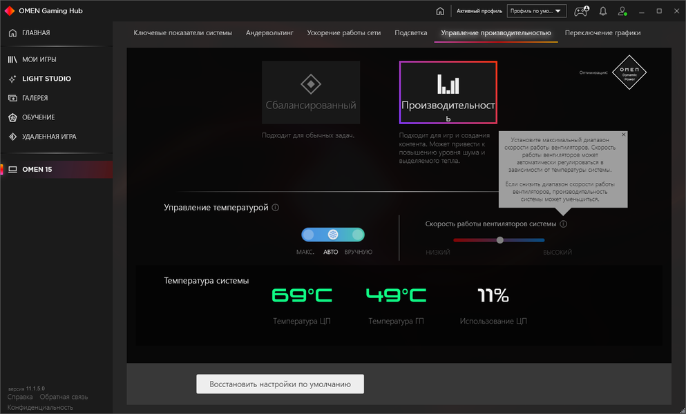 Есть в Omen Gaming Hub и традиционные профили производительности, однако работа системы охлаждения к ним не привязана, она регулируется отдельно. Подробно о разнице между производительным и сбалансированным профилем мы поговорим в разделе тестирования под нагрузкой (и дополним в разделе изучения производительности), а для кулеров доступны три варианта: автоматический, максимальный и ручной. В последнем случае регулируется, насколько можно понять из описания, верхняя граница диапазона используемых скоростей. Опять же, в следующих разделах мы поговорим об этом подробнее. Еще есть не самая очевидная настройка, определяющая, работает ли в ноутбуке только дискретная видеокарта или же дискретная в паре с интегрированной (именно этот вариант, как правило, применяется в ноутбуках с дискретной графикой). И о полезности выбора того или другого варианта (они переключаются через перезагрузку) мы тоже поговорим дальше.
